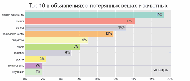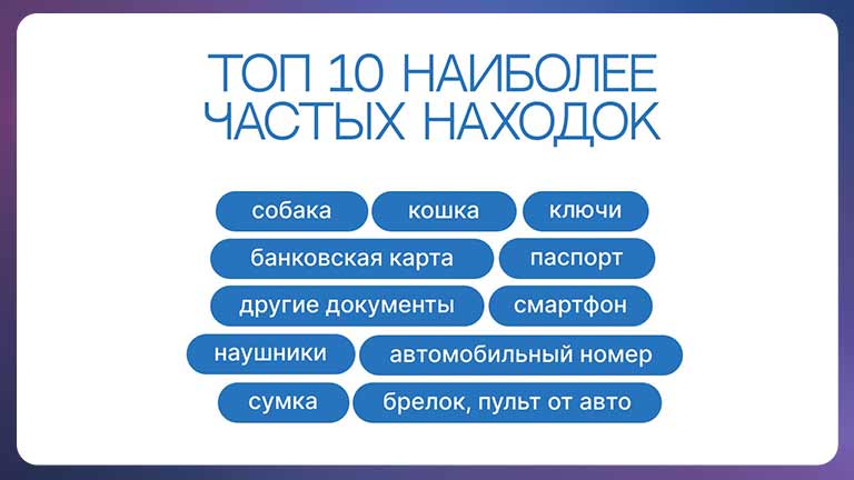 Сентябрь – самый «теряемый» месяц, в течение этого месяца публикуют больше всего объявлений о потерявшихся вещах и животных. Больше всего объявлений о потерях выходит сразу после выходных дней. Чаще всего такие объявления публикуются вечером, после 21 часов, а также в обед, после 2 часов дня.